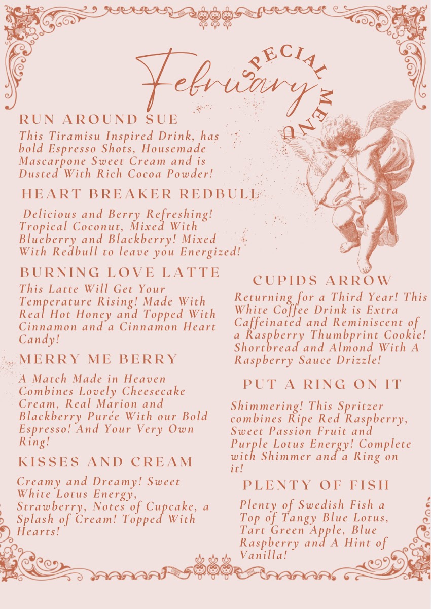 Others: This group features a wide range of creatively named coffee beverages and flavored drinks including Blackberry, Kiwi, Run Around Sue, Heart Breaker Redbull, Burning Love Latte, Merry Me Berry, and several others. These items indicate a focus on specialty lattes, fruit-infused drinks, and seasonal or limited-edition options.