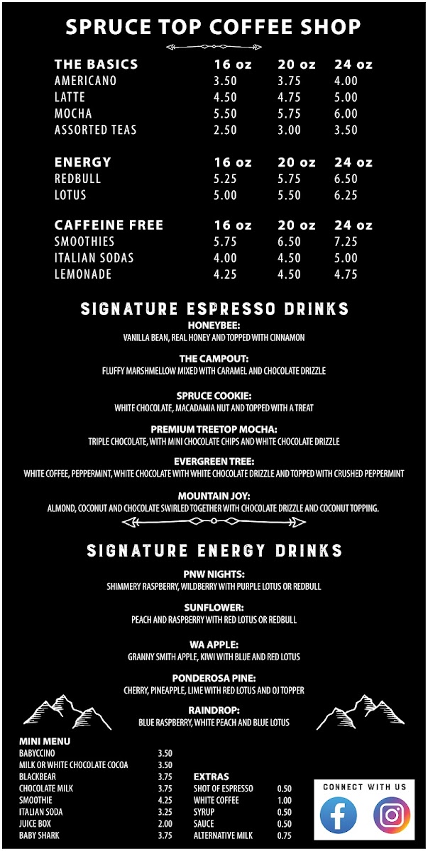 The menu at Spruce Top Coffee Shop offers a diverse selection of beverages primarily focused on specialty coffee drinks and sodas. The menu is organized into several groups to accommodate different preferences and occasions.